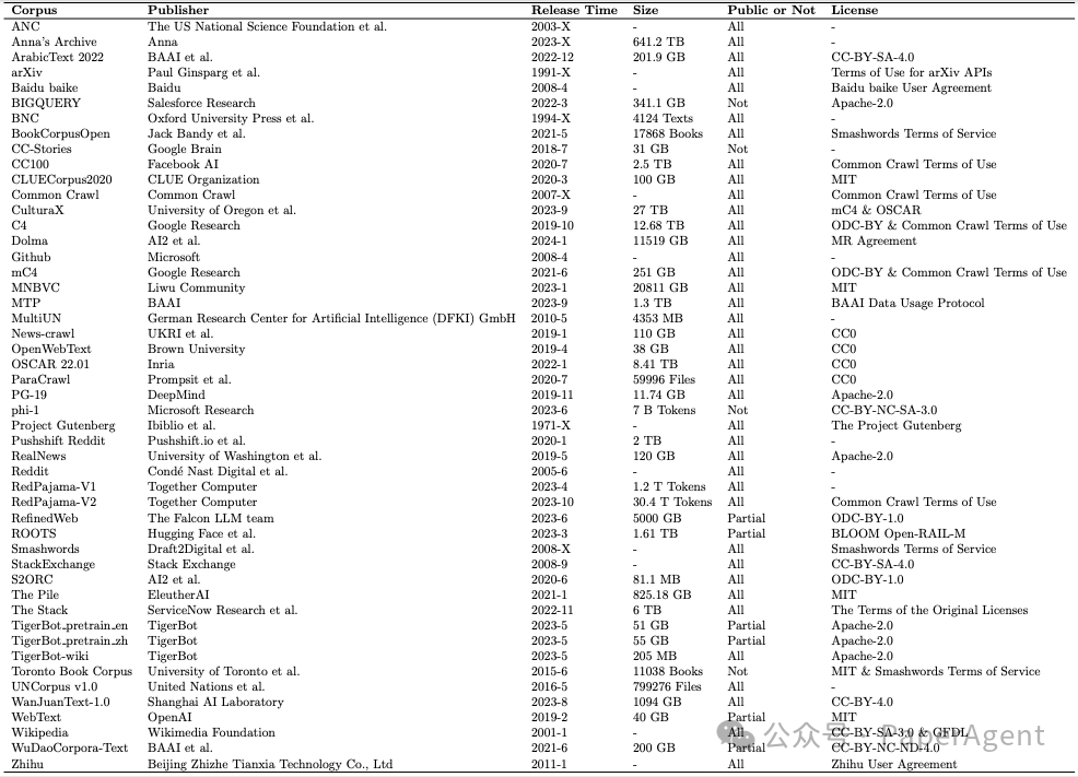 通用预训练语料库信息部分总结。发布时间:“X”表示未知月份。公开与否:“All”表示完全开源;“Partial”表示部分开源;“Not”表示不开源。“许可证”表示该语料库遵循某种协议。如果该语料库是基于其他语料库构建的,那么源语料库的许可证也必须遵守。