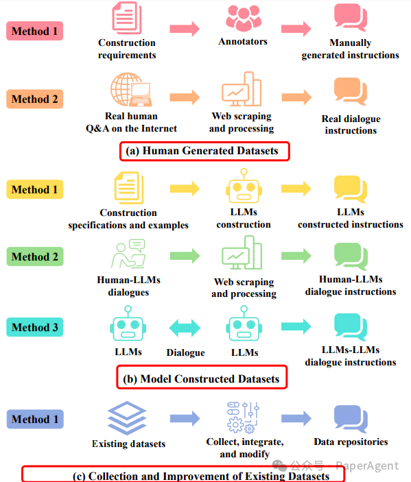 构建指令微调数据集有四种方式:(1)手动创建(2)模型生成,例如使用Self-Instruct方法(3)收集和改进现有的开源数据集,以及(4)上述三种方法的结合。