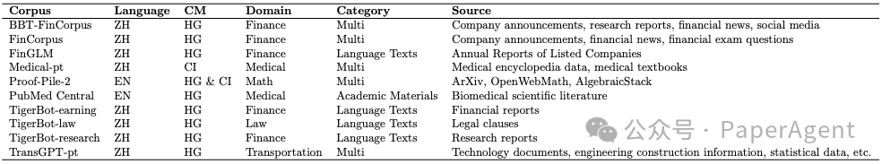 第二种是特定领域的预训练语料库,它专门包含特定领域或主题的相关数据。其目的是为LLM提供专业知识。特定领域预训练语料库分类:金融、医疗、法律、交通、数学。