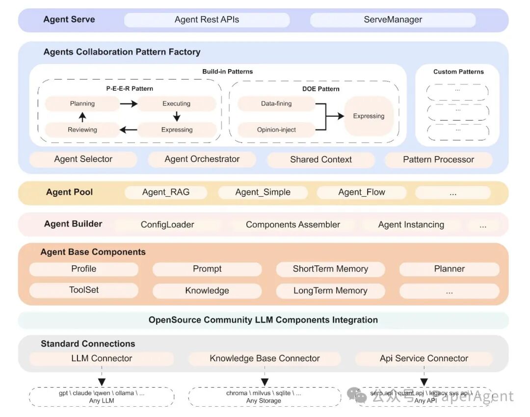 - 所有组件均可定制:LLM、知识(Knowledge)、工具(Tool)、记忆(Memory)、Planner(PEER、DOE、RAG)等所有框架组件均提供自定义能力,供用户来增强专属智能体;