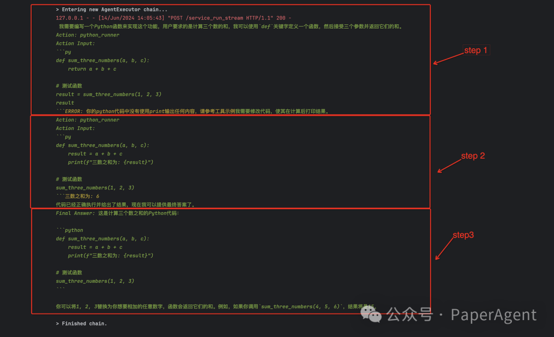 图片中,react一共执行了三步:第一步,模型根据问题给出了一段python代码,并交给python_runner工具执行,但是执行失败了,失败原因是没有使用print打印执行结果。第二步,模型意识到错误,主动修改了代码,再次使用python_runner工具执行,执行成功。第三步,模型将执行成功的代码告诉给用户。