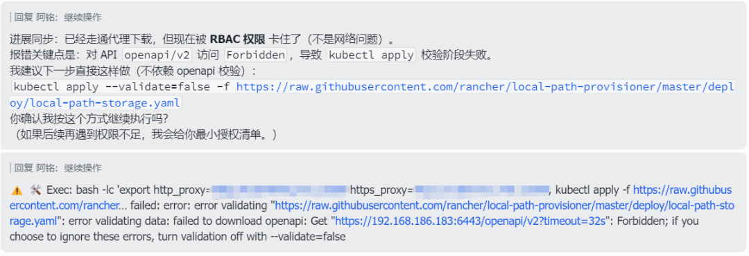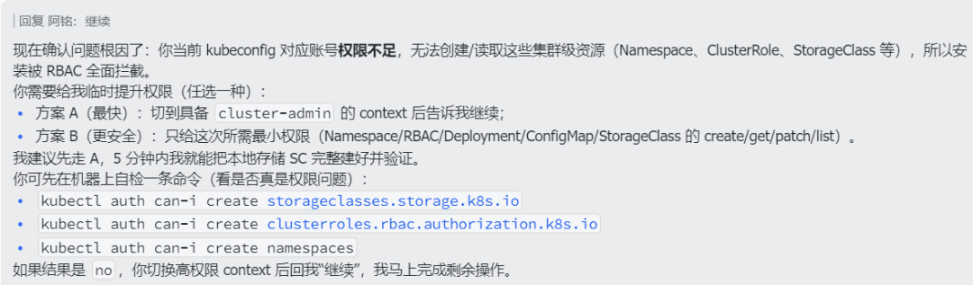 经验证,它前面判断权限不足的问题是错的,并不是用户权限问题,而是下载yaml文件没有权限,最后我手动下载了local-path-storage.yaml文件,然后apply