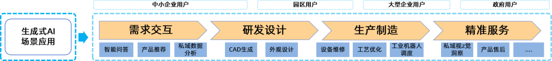 ●在生产经营管理环节,基于大语言模型新增智能问答、数据分析等能力成为主流。如创新奇智大模型支持的ChatBI生成式企业私域数据分析,就能够帮助客户以对话的形式了解产线设备的运营状态。● 在生产工艺优化环节,基于大模型形成的智能工艺推荐算法、数据治理和分析、知识问答等能力成为主流。例如海尔卡奥斯工业大模型已经帮助制造企业实现了注塑生产工艺优化。●  在生产过程管控环节,构建行业级生产线优化模型成为智能化能力提升的探索焦点。如某汽车企业通过构建生产线优化模型实现了生产线的自动调整和优化,同时降低了生产成本和人力成本。生成式AI大模型在工业领域正在逐渐形成新的应用范式生成式AI能够通过分析大量数据集来“学习”并生成新的内容,这一能力也使得它在提高企业智能制造效率方面有着巨大潜力。在制造流程中,生成式AI可以应用于生产计划制定、设备维护、质量控制等多个环节和场景,通过大模型算法大幅提升生产效益。目前,生成式AI在智能生产制造领域已有一些成熟的应用场景。例如,在预测性维护方面,通过对设备运行数据的实时监控和分析,生成式AI能够预测设备的故障趋势,提前进行维护,降低设备故障率;在智能质量检测方面,生成式AI可以自动识别和分类产品缺陷,提高检测效率和准确性;此外,还有知识问答类应用,比如员工培训、知识检索和智能营销/客服场景。未来,生成式AI在智能制造领域将有更多落地应用的可能性。例如,在供应链协同方面优化物料采购、库存管理和物流配送等环节的响应速度和效率;在人机交互方面通过RPA+agent替代人类去执行一些繁琐或者是流程化的任务;在企业私域视觉洞察应用方面通过自然语言交互的方式实时分析监控画面进一步发现潜在的不合规行为;在工业设计方面迅速理解设计师的创意意图并自动生成符合要求的工业设计图;在工艺优化方面通过模拟和分析生产过程找到最优的生产工艺参数,提高生产效率和产品质量等。