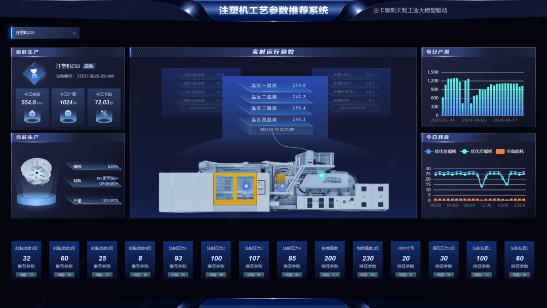 图2:创新奇智基于AInnoGC工业大模型的ChatDoc产品当ChatBI生成了各种各样客户想要的报表后,只需要通过简单的点击、拖拽的操作,就快速制作出车间的生成数据看板,为企业的各级管理人员提供深度数据分析和洞察。ChatBI支持多种格式的数据源、支持SQL代码的展示、利用主动召回技术给出更专业和精确的答案、以及高级别的数据安全保障, 可以让用户操作起来更加方便和安全。另外,在工厂的设备维修过程中,维修人员进行设备故障诊断及设备参数调整时,对于各种复杂的现场情况,需要花费大量时间进行专业资料查询。通过ChatDoc,维修人员仅需语言描述现场情况,即可获得所需信息,从而显著减少故障排查时间,提升设备维修效率。在生产工艺优化环节,基于大模型形成的智能工艺推荐算法、数据治理和分析、知识问答等能力成为主流。例如海尔卡奥斯工业大模型已经帮助制造企业实现了注塑生产工艺优化。以洗衣机工厂为例,注塑是洗衣机生产的重要工序,其生产过程看起来不过模具开合,背后却牵扯着温度、压力、成型周期、模具健康、能耗等复杂的工艺和参数调试流程。而这些,让工厂中使用了数十年的注塑机设备,成了一个只能依靠人工经验调试的“黑箱”。要探索最优工艺,无疑需要打开这只“黑箱”,将老师傅们的工业经验转化可量化的数据和指标,理清其中的千头万绪,让主观经验升华为科学易用的工业智能。沿着物联接入、数据治理、模型建立的推进路径,卡奥斯COSMOPlat搭建起洗涤产业大模型,在关键场景和核心领域沉淀算法和机理模型,以数据透明化为核心,探索洗涤注塑领域最优工艺参数及能耗,提升产业数字化竞争力。一方面,模型形成了待机/停机决策、模具设备匹配、智能工艺推荐算法模型3大核心算法,并将相关领域核心指标定义拉通,打造出透明化、可视化的工厂注塑指标看板,可通过优化排产、模具使用、工艺和智能决策,助力工厂在保证质量的前提下,实现成本和能耗最优。在工厂落地后,大模型已帮助设备能耗降低5%至10%,节拍提升4%至9%,大幅优化整体生产效益。另一方面,通过对内外部知识的梳理和学习,模型搜集和学习了工程师多年积累的经验与工业知识,注塑相关知识库沉淀知识量超过10 TB,可通过机器人、小程序、APP等形式进行使用,目前可在秒级之内形成对相关问题的反馈,实现了工业知识的普惠应用。同时,基于全面的数据连接和分析,模型还助力工厂实现了数据质量的改进,例如发现并解决了部分注塑机能耗数据指标不明确、连接不充分的问题,以及AIoT平台部分数据重复与缺失的问题等,也为企业沉淀数据资产、创新数据应用提供了进一步支持。以模具工厂为例,卡奥斯工业大模型COSMO-GPT助力工厂完成智能化改造,首创专家模型调度实现智能参数推荐,整体生产效益大幅优化。在注塑车间,技术人员只要给卡奥斯工业大模型COSMO-GPT下达口令,它就能够自动识别后调取数百个工艺参数,并立即指挥注塑机开始工作,短短几十秒钟产品就做好了,误差不超过头发丝的粗细。如果靠工艺师来做数百个参数需要调整1个多小时。应用卡奥斯工业大模型COSMO-GPT不仅设备调整时间缩短了,而且降低了调试成本。过去,在调试生产的过程中,所有调试出来的不合格产品都是作为废件处理的,现在的调试效率大概提升约50%,大大降低了浪费。除了出色的生产、调试能力,卡奥斯工业大模型COSMO-GPT还可以对设备的健康状况进行提前预警,减少设备故障,生产效率提升了5%,节能降耗10%,量产调试降费50%以上。目前,注塑专业工艺员和卡奥斯工业大模型COSMO-GPT正在通过知识问答的方式完成“经验传授”。平台将把工艺员的经验沉淀成训练卡奥斯工业大模型COSMO-GPT的语料,帮助大模型攻克难题,最终走向自主工作、自主校错,实现真正的无人化。