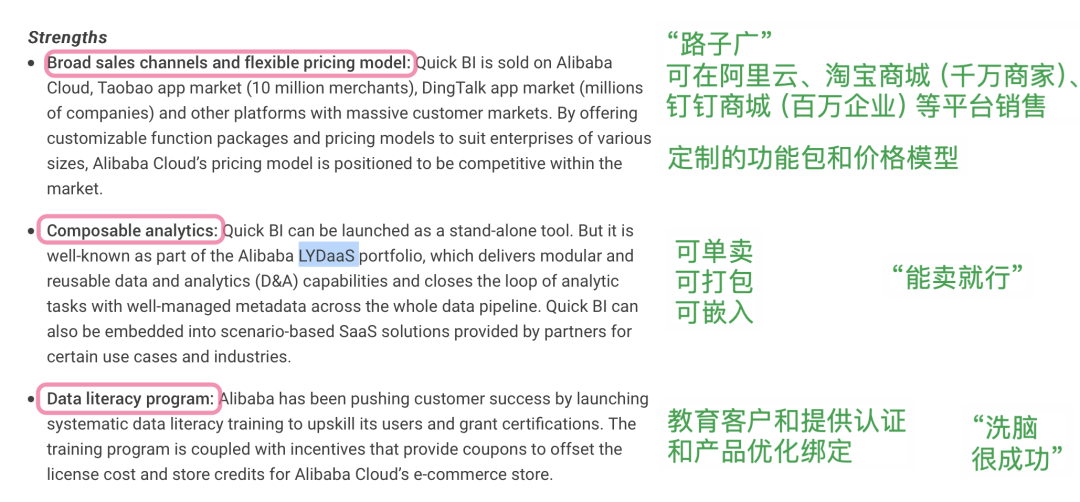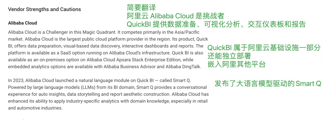 先看一下瓴羊自己如何解读的 Gartner 报告,它总结了 QuickBI 的“独特优势”,如下所示:‍‍‍‍‍‍‍