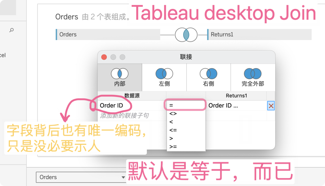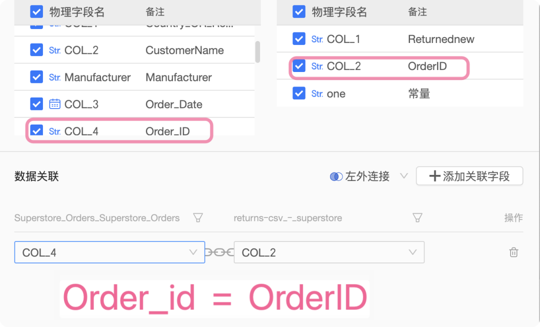 我花了点时间,终于确认应该是 Order_id 等于 Order_id,然后找到了它们对应的“数据库字段”,于是选择 Col_4 = Col_2。折腾呀。