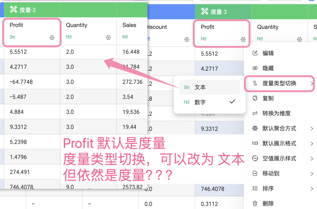 比如默认度量的“profit”可以“度量类型切换”改为“文本”,但由于数据类型和维度/度量到底又是分离的,所以默认聚合方式就变成了“计数”。