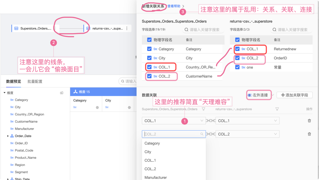 当拖入另一个数据表时,默认出现一条线(我以为是关系来了)。放下之后,默认出现了 COl_1= Col_2的“关系条件”,我也以为挺好。