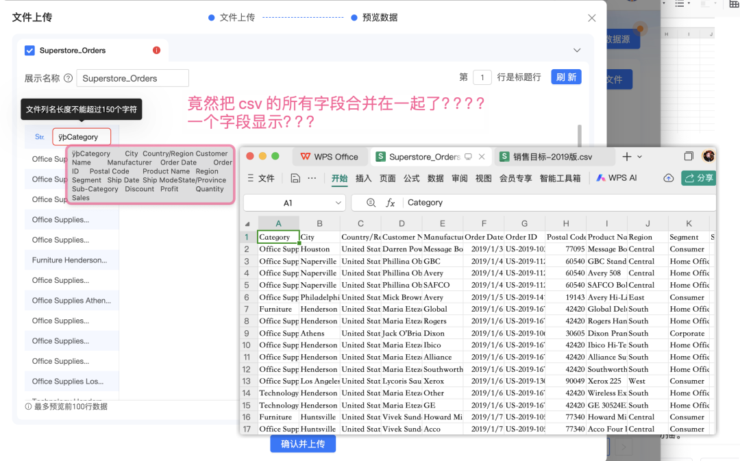 【补充】我后来仔细查看了官方文档,最可能的原因是很多英文CSV 文件默认是 UTF-16格式,而 QuickBI 目前仅仅支持 UTF-8格式!在帮助中给出了介绍,但在上传过程中,遇到问题会缺少必要的引导。