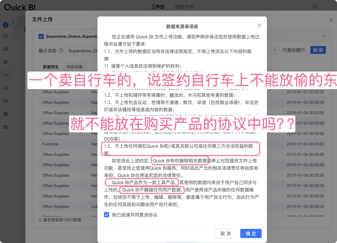 一边口口声声说“Quick BI 产品作为一款工具产品……不触碰任何用户数据”,一边又说“……任何侵犯 Quick BI ……合法权益的数据……Quick BI 有权删除相关数据……”