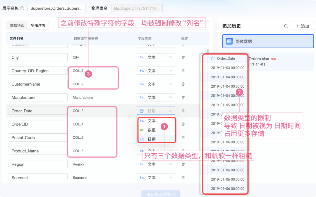 惊奇地发现,我在年初批评的一些问题被修改了,但不彻底。比如数据库字段名称,年初时是所有字段完全重命名为 Col_x 格式,如今只把包含特殊字符的做了处理,何必呢。你把 Order Date 也改为 Order_date 不就好了??