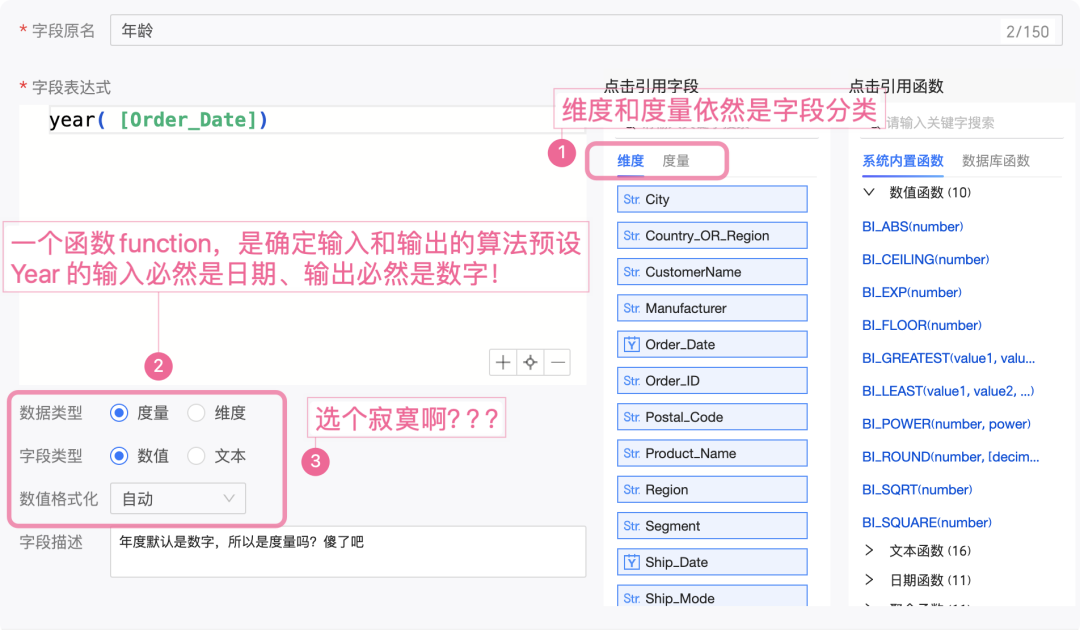 不从根本上思考函数的本意,却为每个函数设置事后的三个选择:维度/度量、文本/数字,还有自定义格式的设计。此处设计有百害无一益!!!是 QuickBi 产品经理“理论贫乏”的最完美体现!