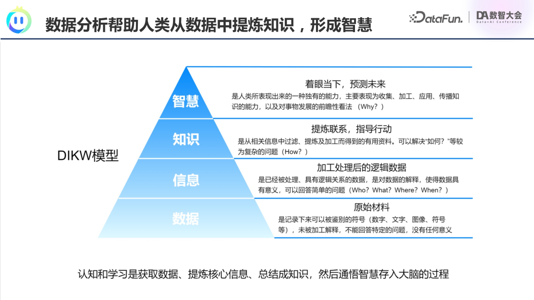 没有经过加工处理的底层数据并没有太多意义,无法回答很多特定的问题。而数据分析则帮助人类从数据中提炼知识,形成智慧。DIKW 模型主要描述的就是如何从数据层到信息的抽取,再到知识,最终形成人类所积淀的智慧。