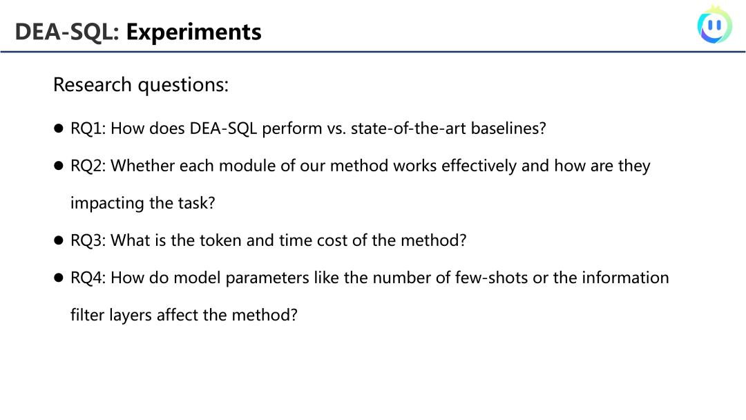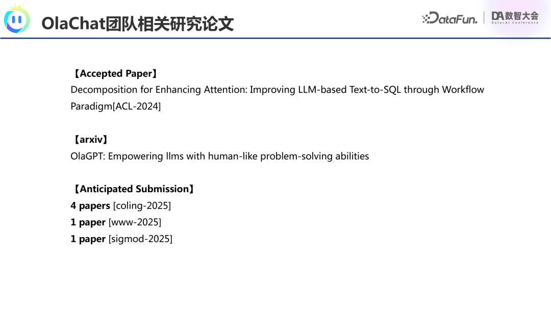 除了上述产品相关实践之外,我们还有一些相关的科学研究。目前公开了两篇论文,还有六篇论文在整理中,预计也会放到 arxiv 当中。这些论文都是与前面介绍的能力相关的内容,比如 SQL 纠错、怎么选表等等。