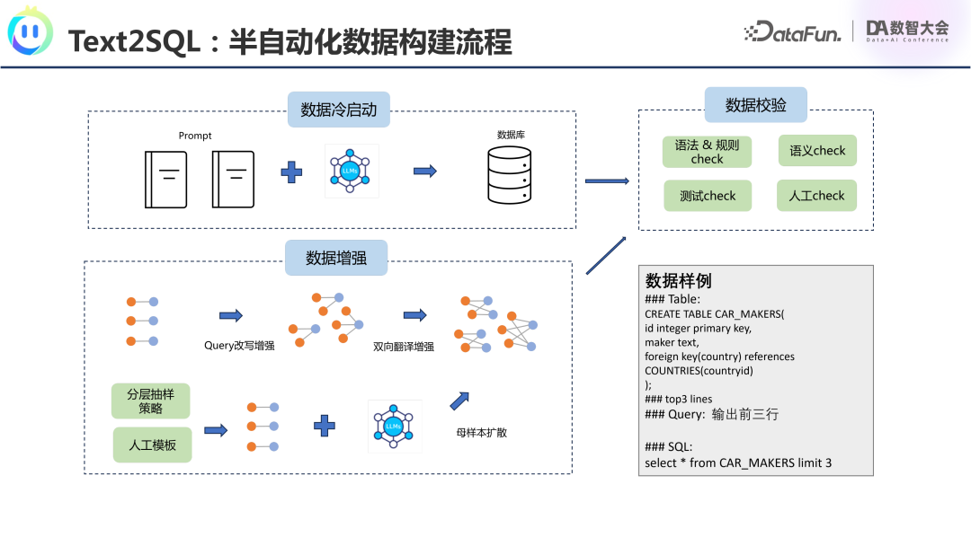 这个数据能否直接使用?肯定是不能的,语义层还是会有一些问题,因此还会经过一个数据校验的模块,除了语义校验之外,我们还去做语法和规则的 check,以及线上执行测试,保证这个 SQL 一定是对的。语义层的 check 就是保证它跟 query 之间是匹配的。除了这三种之外,我们还会做一个人工抽样检测,因为数据质量是重中之重。