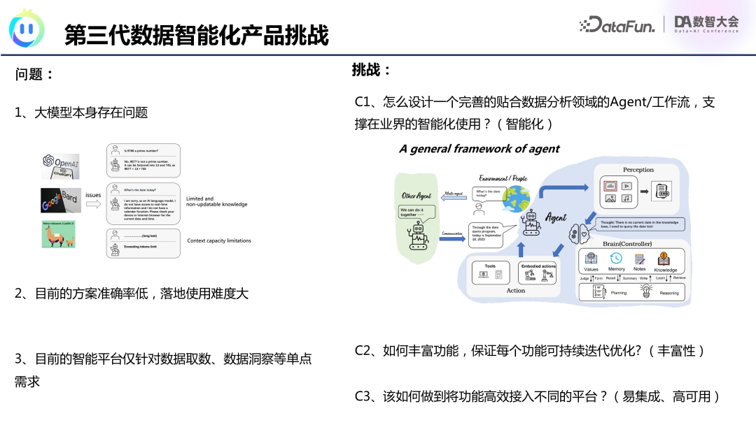 解决了数据层面的问题之后,接下来介绍 Agent 的设计。下图右下方列出了存在的一些问题: