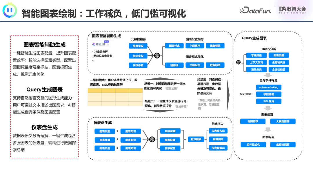 - 图表智能辅助生成:一键智能生成图表配置,提升图表配置效率,智能选择图表类型、配置出图指标维度及坐标轴、图表标题生成、视觉元素美化。