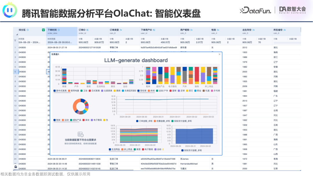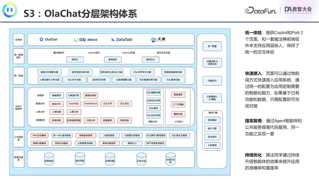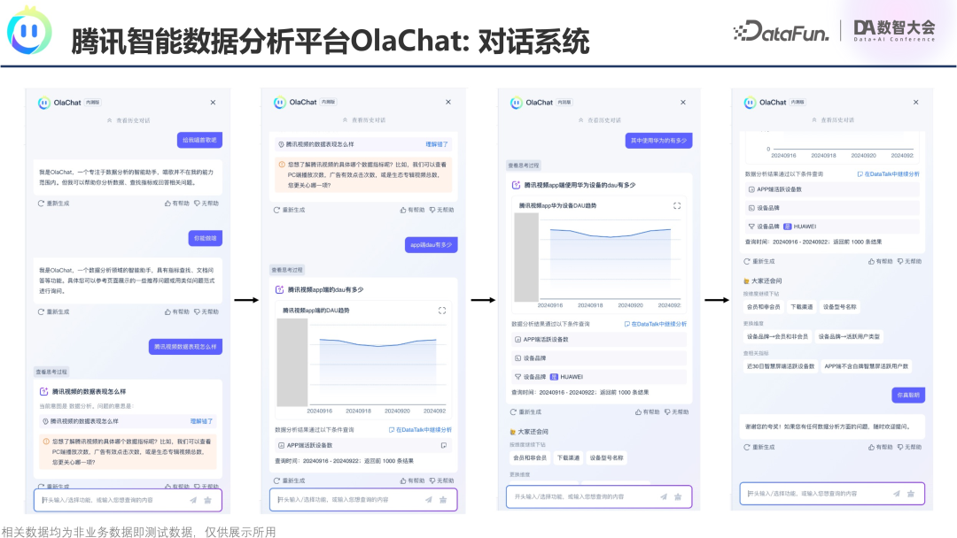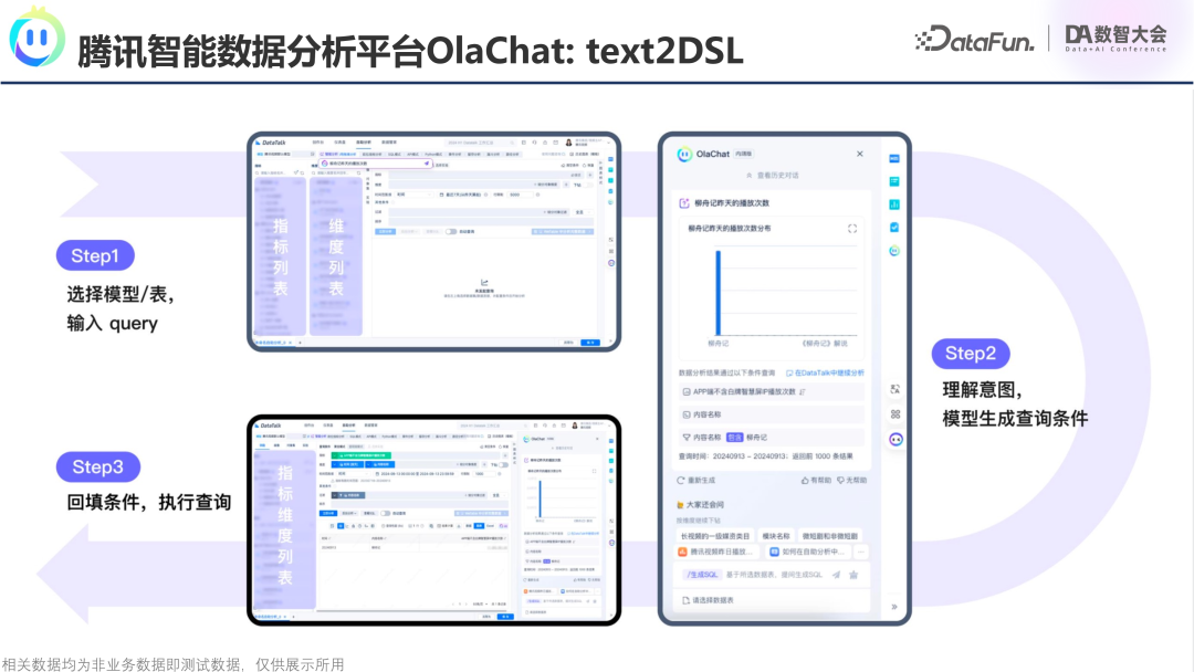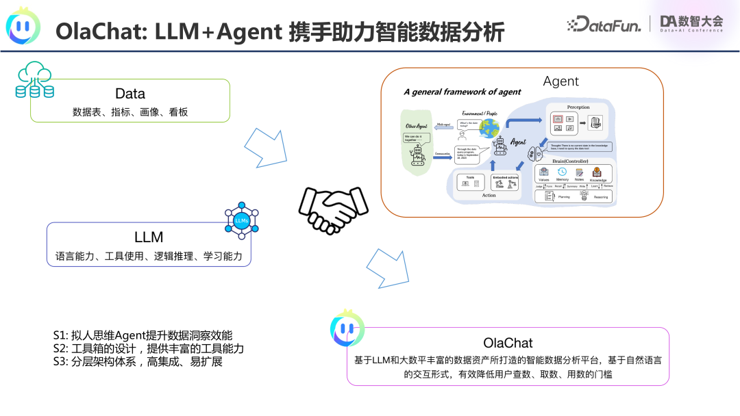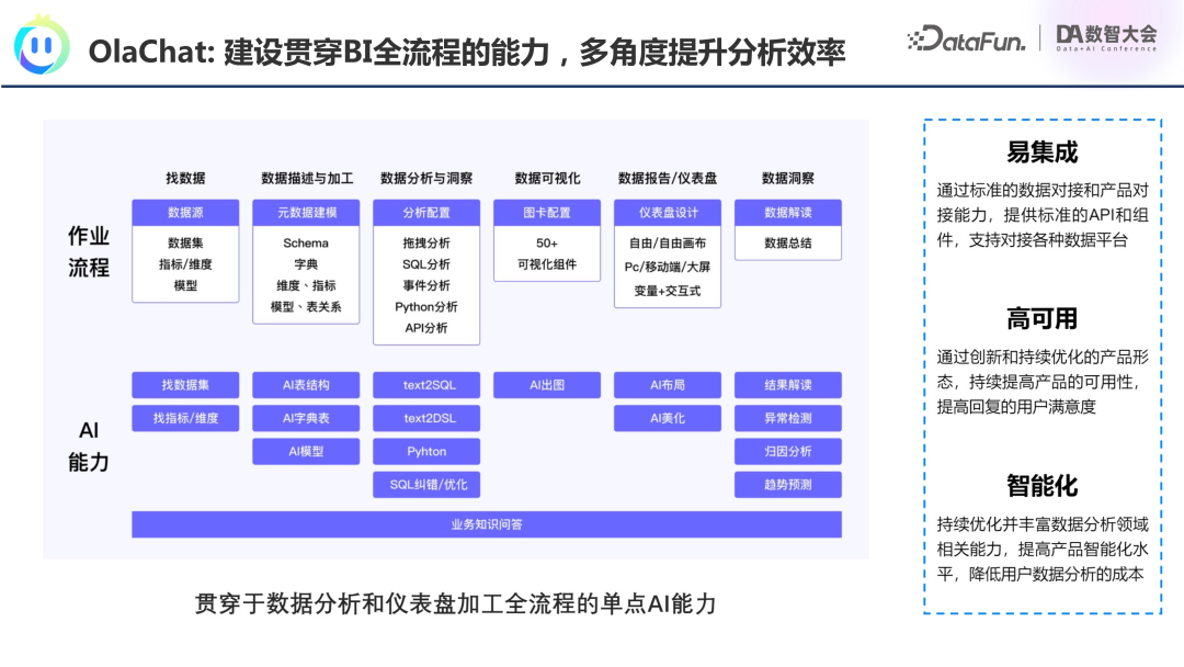 - 首先是 OlaChat 一站式的产品形态,一站式指通过一个 query 这种自然语言的问题,它能够理解用户意图,明确任务,完成从找数据表,到生成分析图,最后再去展示分析图和分析结论的整个过程。