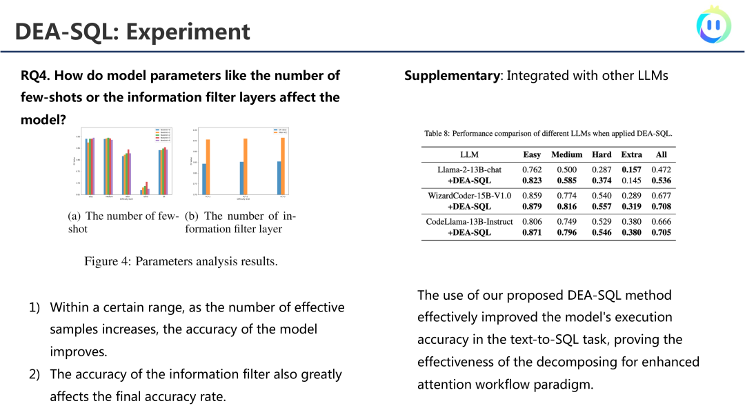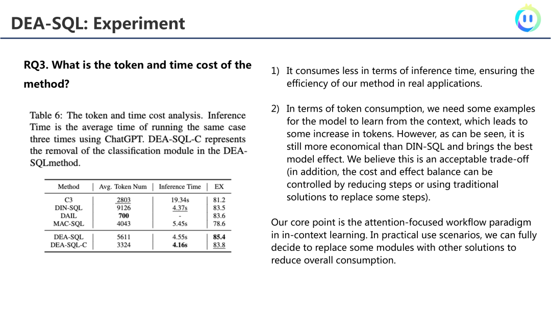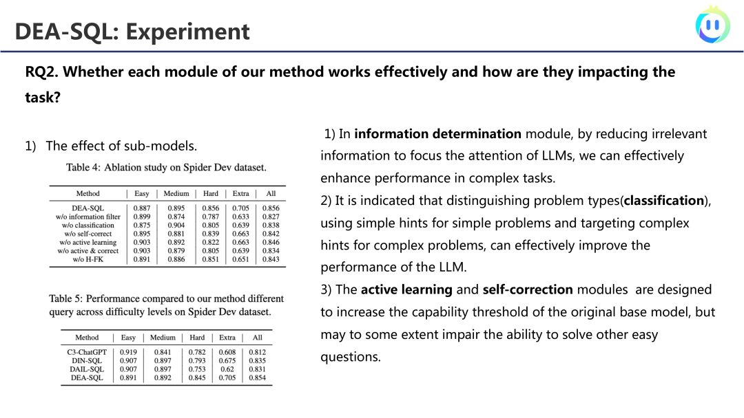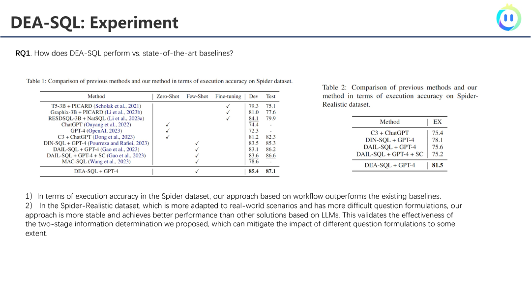 下图左侧和右上面的图都来自于我们的一篇相关 paper。我们在 Spider 和 BIRD 数据集上进行了尝试,效果比较理想,目前已被 ACL 接收。