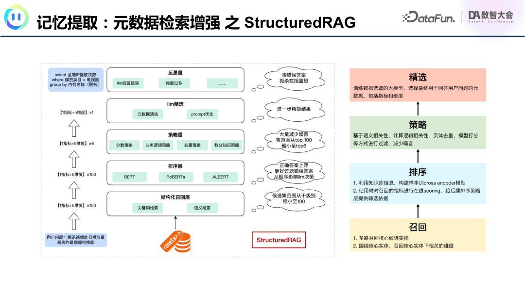 再来看 StructuredRAG 的设计。它借鉴了推荐的方案,通过字段或者用户问题里面拆出来的实体去检索,再多路召回。召回之后对召回的指标利用 Cross Encoder 模型进行粗排,然后在策略层基于语义相关性、计算逻辑相关性、实体去重、模型打分等方式进行过滤,减少噪音。最后精选层通过大模型做精选。这里为什么要选大模型?因为排序模型只能知道 Top N,它没有办法精确知道字段到底对应几个字段,但大模型具备这样的能力。通过这个设计,我们以表数据为例,比如几万张表,最终可能精选到只有五张表,其中字段信息也会有极大幅度的减少。