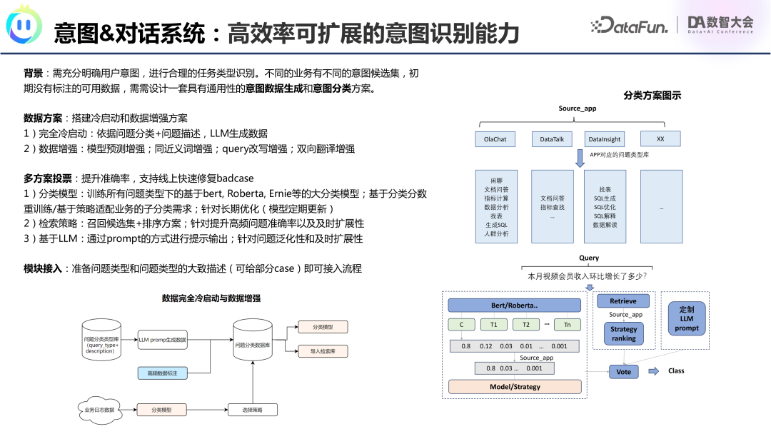 接下来介绍一下意图分类的实现细节,这里跟传统意图分类有比较大的区别,因为我们要支撑很多产品形态,而且每个产品的候选意图并不一样。下图右侧可以看到 OlaChat 有更多的能力。为了实现一个通用化的意图识别方案,我们提出了一个多方案投票的策略去提升其整体的准确性,并能够做到线上 badcase 的快速修复。