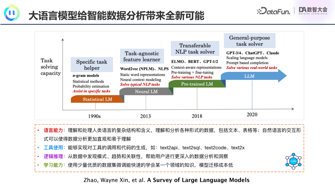 大模型的发展给智能数据分析平台带来了前所未有的机遇。回顾 NLP 相关技术的发展历程,上世纪 90 年代,初期的统计语言模型主要解决非常基础的自然语言问题;到 2013 年左右,以神经网络语言模型为主,可以解决典型的 NLP 问题;再到 2018 年左右,出现了 BERT 这种 transformer 类的模型,越来越多的 NLP 任务得以实现;2020 年生成式大语言模型问世,直到现在万亿模型也已经出现,已可以解决各种真实世界中的问题。