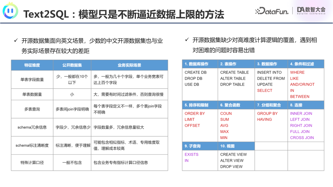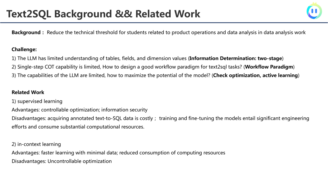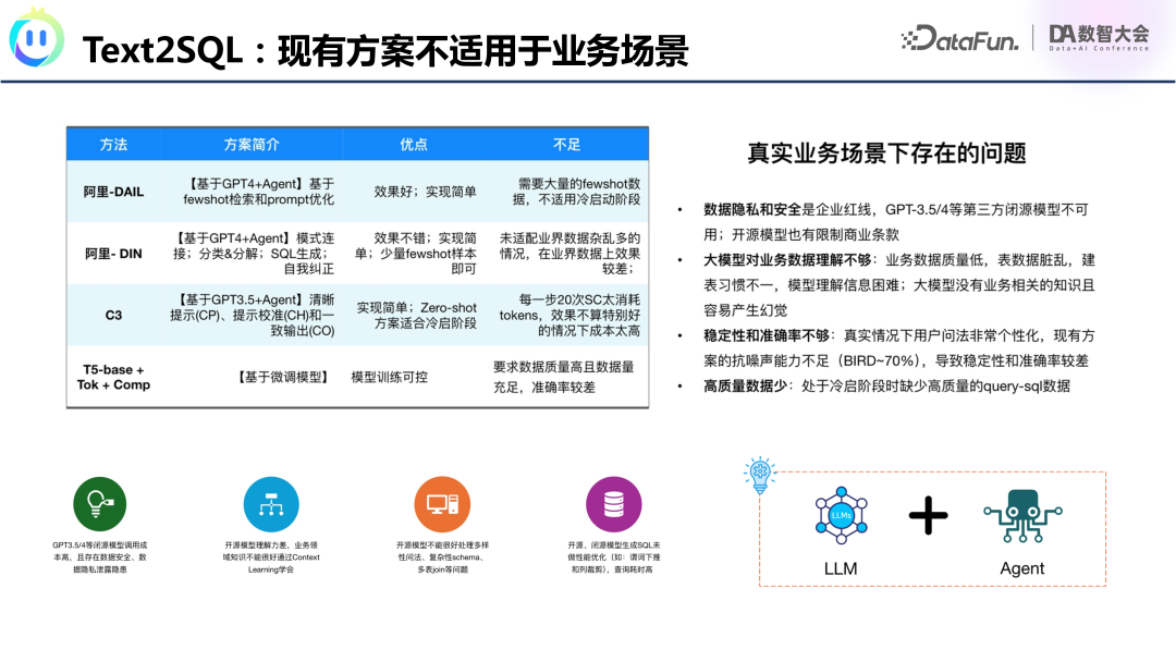 我们又分析了真实业务场景存在的问题,主要包括以下几大方面:首先是数据隐私和安全问题,这是企业红线,GPT3.5/4 等第三方闭源模型不可用,开源模型也有限制商业条款;其次是大模型对业务数据理解不够,业务数据质量低,表数据脏乱,建表习惯不一,模型理解信息困难,大模型没有业务相关的知识且容易产生幻觉;此外稳定性和准确率不够,真实情况下用户问法非常个性化,现有方案的抗噪声能力不足 (BIRD~70%),导致稳定性和准确率较差;而且高质量数据少,处于冷启阶段时缺少高质量的 query-SQL 数据。