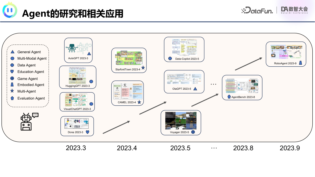 从去年开始 Agent 领域开始变得非常热门,下图罗列了一些去年的相关工作,从最早期的 AutoGPT 这种通用化 Agent 发展到 2023 年 5 月出现的数据领域的 Data-Copilot,但是它不太适用于业界,因为它是完全自动化去生成接口,因此在同时期我们团队提出了 OlaGPT(通用 agent 框架,论文和代码均已开源)。