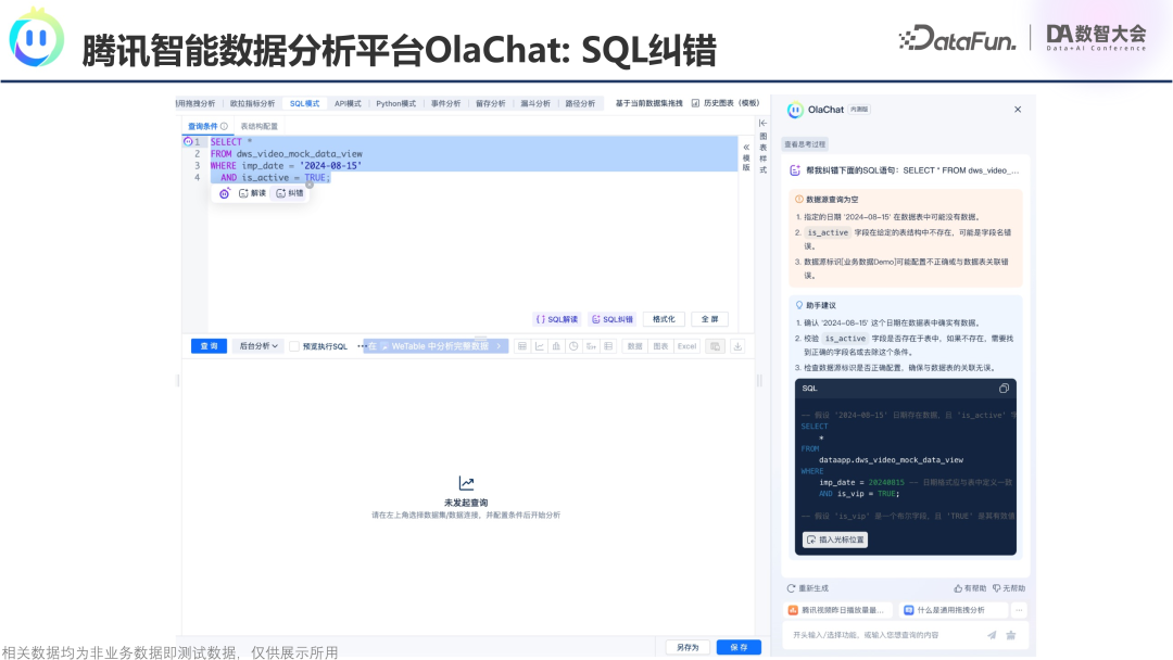 - 第三个是 OlaChat 做了一个 IDE 的产品形态,这一块跟技术人员比较相关,可以在这里做快捷的代码开发,比如可以进行 SQL 纠错优化。