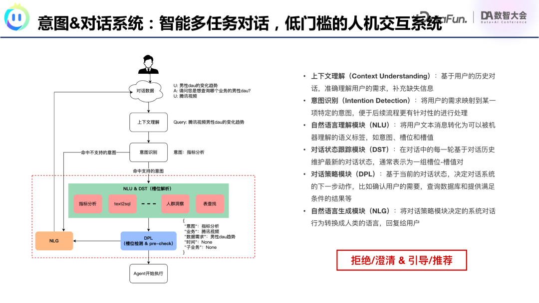 设计目标是实现拒绝和澄清以及引导和推荐能力。拒绝是指有些解决不了的任务就不要硬解,而是应该拒绝。引导和推荐指的是有些用户在刚使用系统时不知道该如何使用,引导/推荐模块可以去生成一些相关问题,引导用户去使用。