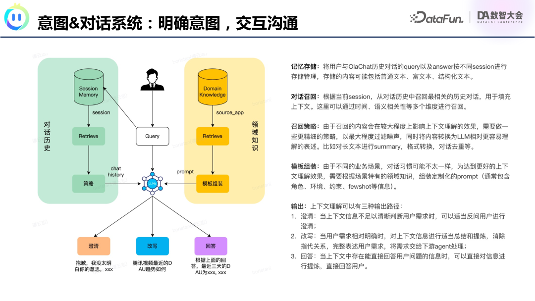 下图中可以看到,左边的对话历史以及领域知识检索实现了澄清、改写以及回答三种能力。