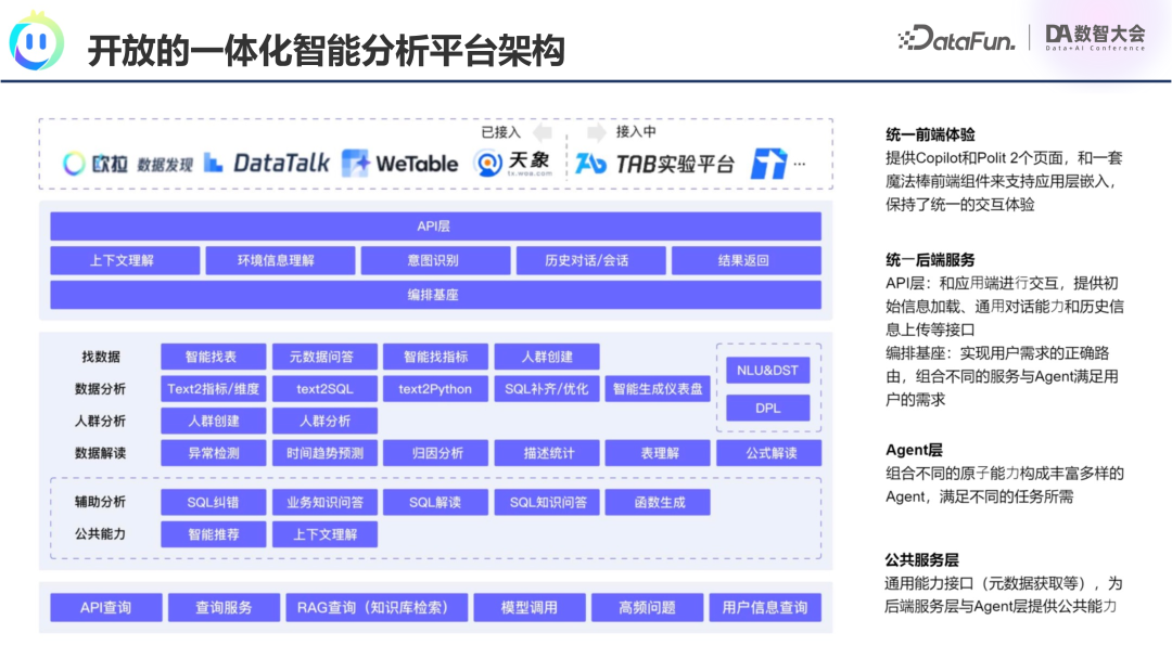 利用我们本身的大数据平台,其拥有非常丰富的数据,包括指标、画像、看板等数据,再联合 LLM 加 Agent 的方案去实现整个智能化分析平台。我们希望它能够易集成、高可用、智能化,能够有效降低查数、用数、取数的门槛,提高数据分析效率。
