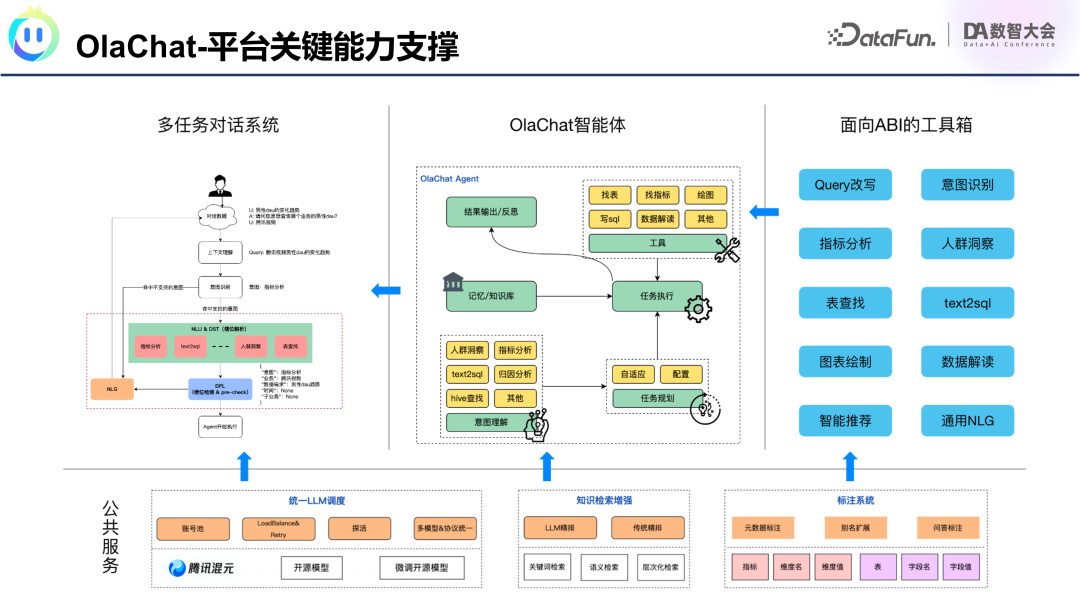 整个平台的支撑主要可以划分为四个部分:第一个部分是刚刚提到的多任化对话系统,主要负责跟人类进行对话以及意图的分类,也就是要路由到哪个任务;第二部分是 OlaChat 智能体,主要负责任务的编排和规划;第三部分是面向 ABI 的工具箱,这里提供了非常多的基础原子能力;最后是公共服务层,在实际开发过程当中能够提供一些公共的支撑能力,比如大模型调度的能力,开源大模型或者是内部的闭源大模型都可以进行调度,同时支持检索增强,此外还有标注系统,可以进行数据标注和数据沉淀。