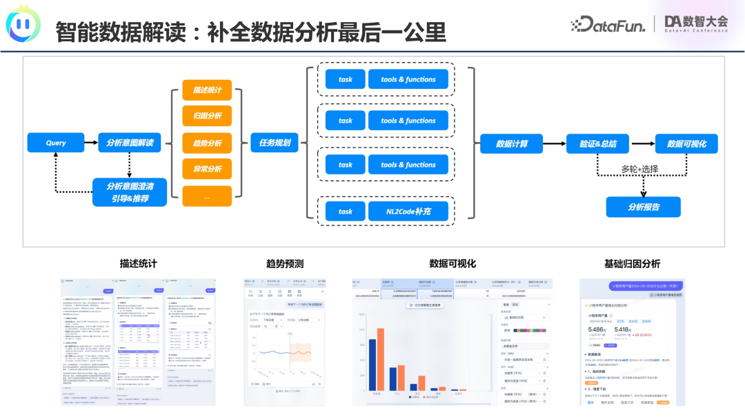 智能化数据解读实现的主要能力包括描述统计、趋势预测、数据可视化和基础归因分析等。我们通过 query 去分析用户意图,比如它适用于归因、趋势,还是异常或者描述统计;识别出来之后,会做任务的规划,确定需要哪些 task,要选哪些工具,哪些函数,有一些工具的函数是我们事先准备好的,如果没有就通过 NL2Code 模块进行补充;编排好之后会经过数据计算,对得到的数据结果逐一验证并总结;这里可能会经过多轮,我们会让大模型从中挑选出最适合的,最后再加上可视化的能力,汇总成最终的一个分析报告。