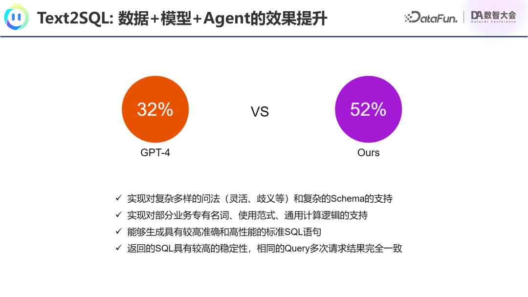 经过前面数据加模型再加 Agent 的努力,目前在我们自己的数据集上效果可以从直接用 GPT4 的 32% 提升至 52%。它能够支持复杂多样的问法 (灵活、歧义等)和复杂的 Schema;实现了对部分业务专有名词、使用范式、通用计算逻辑的支持;能够生成具有较高准确和高性能的标准 SQL 语句;返回的 SQL 具有较高的稳定性,相同的 Query 多次请求结果完全一致。