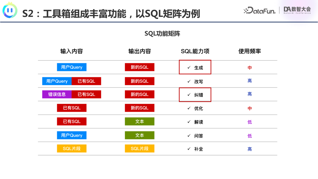我们当时有提出一个丰富性的挑战,因此我们搭建了非常丰富的功能,这边以 SQL 功能矩阵为例,目前已实现 SQL 生成、改写、纠错、优化、解读、问答、补全所有这些能力。