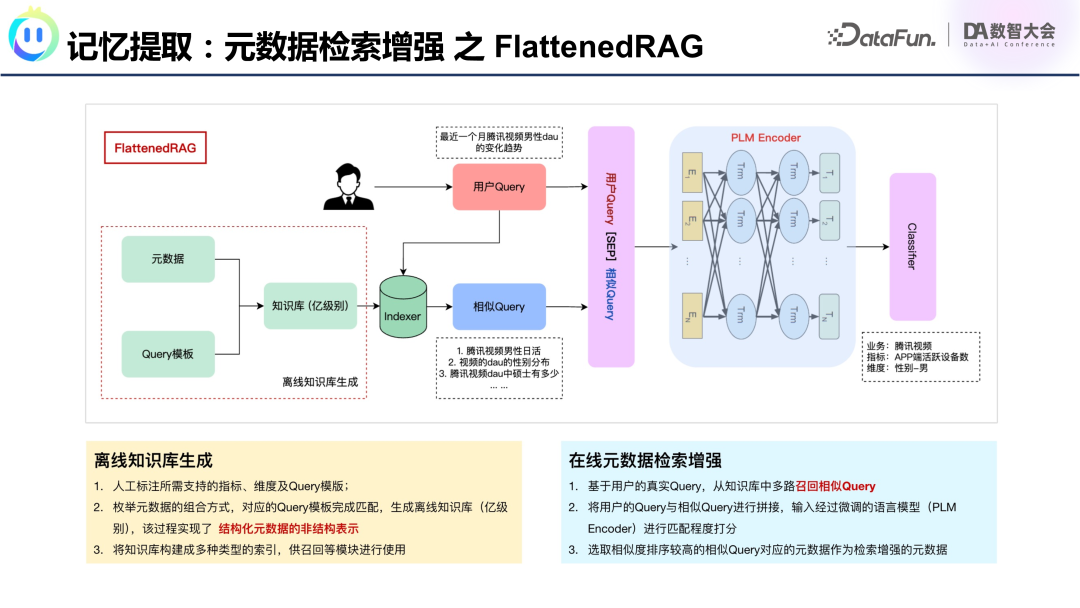 先看一下 FlatteredRAG 的实现细节,在一开始会准备一些 query 模板,将指标和维度组织成类似人类提问的话。元数据就是刚刚提到的,由多个指标、多个维度组成。元数据和 query 模板之间进行组合,就会组合出一个非常庞大的知识库。这个知识库会经过一层校验,因为里面会有一些脏乱的数据,我们就会将其放到检索里面,当用户问题进来的时候,比如问男性 DAU 变化趋势,这时我们会从检索库里面去寻找相似的 query,如果打分足够高就由这个模块直接进行输出。下图右侧可以看到我们搭建了一个模型,模型结构是在传统分类模型之上又增加了适配结构化数据的设计。