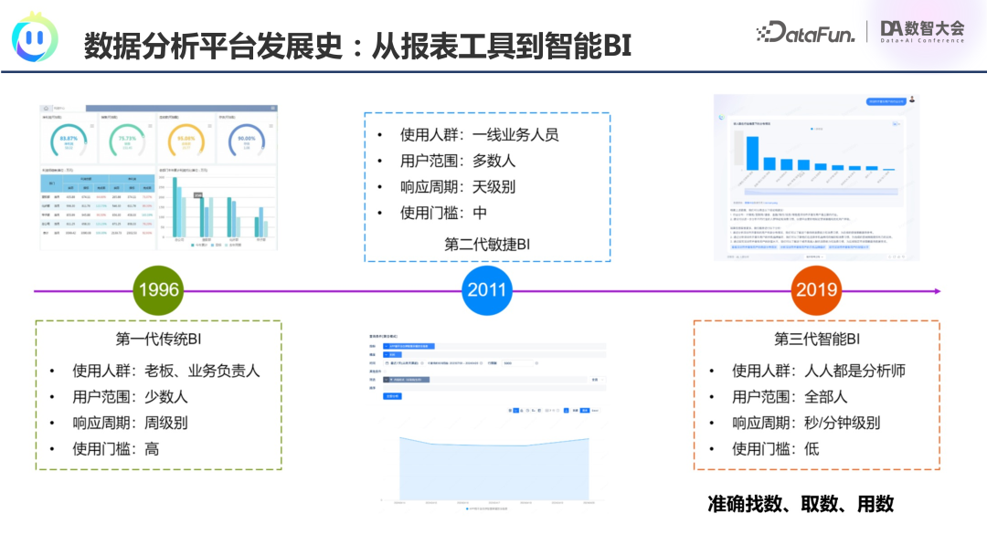 再到 2019 年,进入智能 BI 时代,主要目标是让人人都成为数据分析师,通过非常简洁的自然语言去与平台交互,使用门槛非常低,能够实现准确的找数、取数、用数。