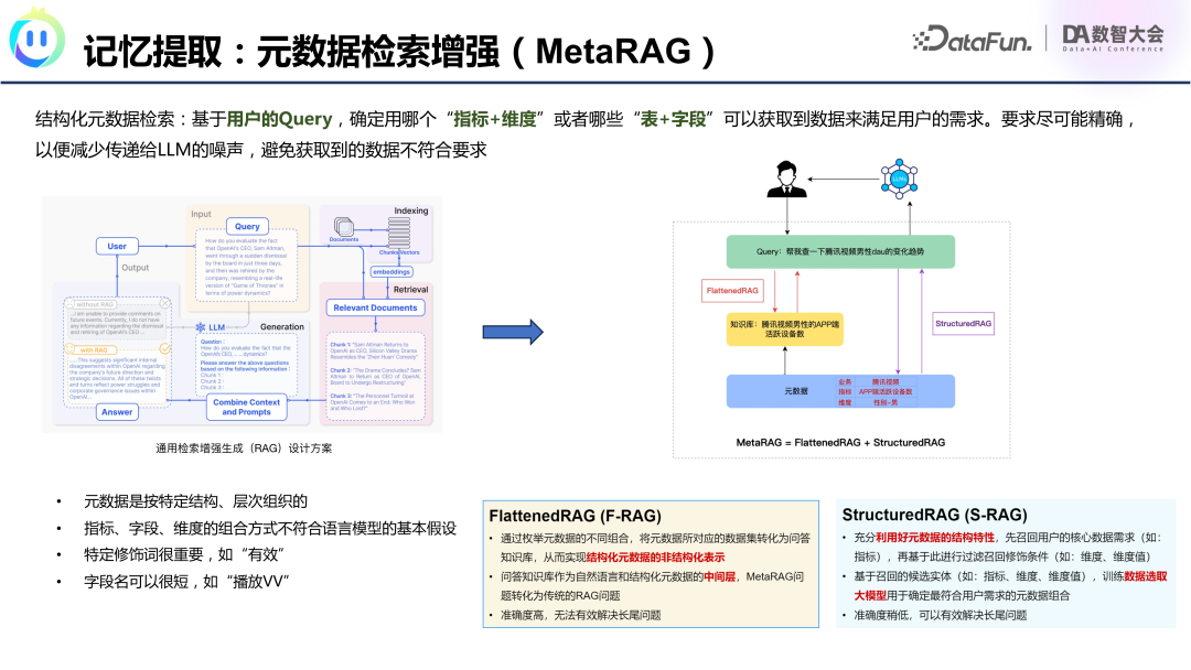 接下来介绍两个元数据增强的方案,首先是 FlatteredRAG(F-RAG)方案,通过把结构化的数据转成非结构化的数据,再利用非结构化这种传统的方案做检索;另一个是 StructuredRAG(S-RAG)方案,利用元数据的结构特性先召回用户的核心数据需求 (如指标),再基于此进行过滤召回修饰条件 (如维度)。
