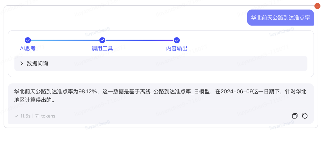 为提升业务的使用体验,确保统一平台统一问答入口出口,后台将知识问答与数据分析能力进行了有机融合。用户query提出后,首先调用数据分析问答接口,若意图命中输出数据类结果,若未命中数据意图,则再次请求知识问答接口,返回知识卡片结果。四、能力展示