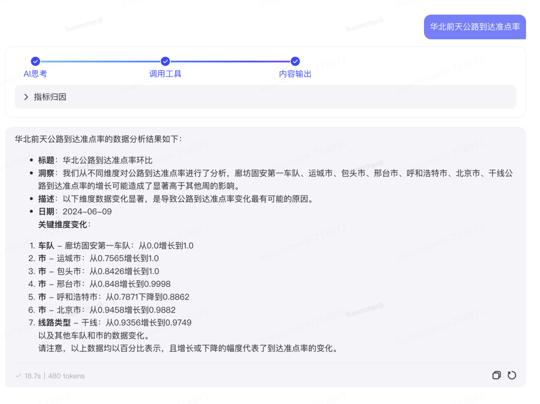 使用人数和咨询次数逐步提升,当前每周活跃用户保持在50~100左右,咨询次数大于500+,覆盖总部九大区共154个组织,咨询人数347人,共68个岗位。;调度、精益改善相关岗位的智能人员,每天需要高频的查看派车单轨迹,现在工作台查询轨迹需要4步操作,查询起来需要2~3分钟,现在通过运力小智快速查询简化成一步,查询时间减少为1分钟内,大大提高了轨迹查询的效率,截止当前,轨迹相关咨询次数共1230次,一线人员反馈使用效果比较好针对一线调度人员,当发生车辆故障、经济纠纷、交通事故等人为在途异常等情况下,需要通过车牌号查车辆注册时间等信息来核查异常,需要对比行驶证信息,另外有些司机上传的图片是PS的,需要通过看照片抓这种PS行驶证的情况。以上两种情况下需要通过车牌号查询对应的行驶证正反面的图片信息,但是运营同事反馈在一些场景下不在电脑旁边时,查询很不方便,需要发给在公司的同事帮忙查询,工作效率低,针对这种情况,现在通过运力小智问答的方式直接返回行驶证信息,查询时间由10分钟减少为1分钟内返回结果数据分析类,运力效率、体验类指标一线人员咨询结果成功率70%左右知识问答类,一开始用户知识类的发散提问成功率20%~30%,引导用户熟悉使用后,现在用户特定场景的使用率提升,知识问答类成功率达到50%左右六、总结与规划
