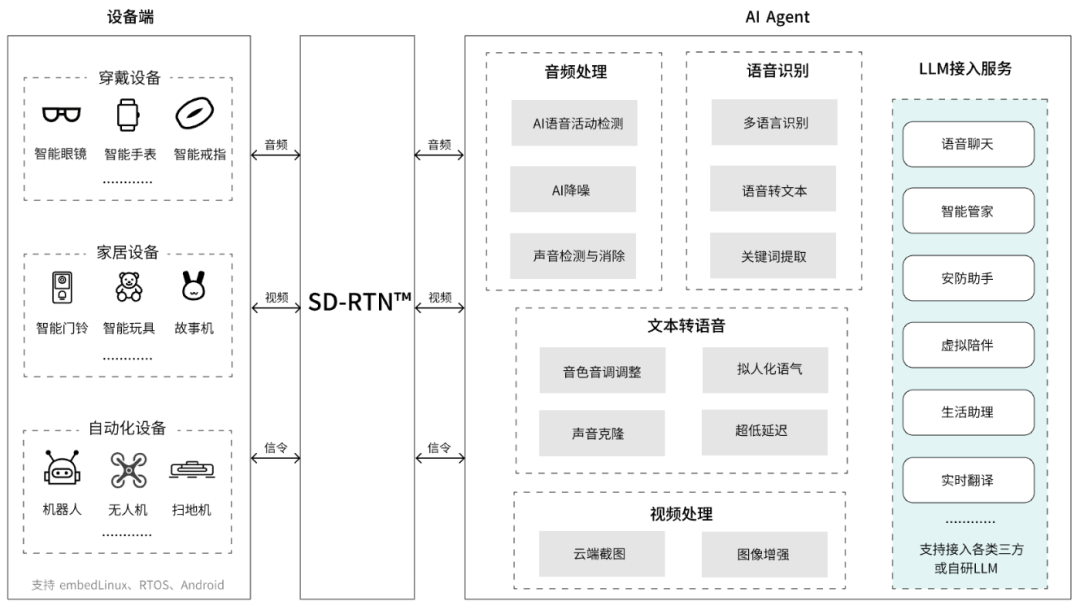 图:声网 AI x IoT 智能硬件解决方案架构图1、毫秒级人机交互体验:声网 AI x IoT 智能硬件解决方案进一步优化了端到端互动体验,实现人与设备之间基于 LLM 的毫秒级互动体验。通过在客户端进行低延迟的音频采集和播放、借助声网自研的 SD-RTN™ 实时传输网络实现全球范围的低延时 RTC 传输,并进一步通过更快速的 LLM 推理首字耗时、低延迟流式 TTS、同机部署等一系列技术手段,保证对话的实时性与流畅性。2、文本/图像/音频/视频的多模态交互:在智能硬件场景,声网的解决方案同样支持文本/图像/音频/视频的组合输入&输出,同时开发者与企业也无需额外集成 STT、TTS 等模块化组件,一套方案就能快速构建 AI 实时语音对话服务。3、聚焦关键信息,提升语义理解度:在 GenAI 场景,能否支持随时打断也成为衡量大模型智能化的重要指标,声网的解决方案也支持先进的 AI-VAD 技术,可实现灵敏的自然语音打断,模拟人类对话的自然流动,让对话更加真实、自然。4、AI降噪保障语音对话清晰、顺畅:针对语音对话中经常会出现的噪音、回声等问题,声网拥有行业领先的音频 3A 能力,通过AI噪声抑制、背景人声过滤、音乐检测/过滤等算法,确保人与 AI 的对话不受环境干扰,始终保持顺畅。5、实现多模态 AI 能力普适,实现任意可视设备的智能化体验:在硬件场景构建音视频互动需要特别注意 SDK 对芯片、系统的适配性以及包体的体积等。声网的解决方案适配支持 70+ 主流、高性价比的芯片/模组,例如:展锐 Cat.1系列芯片、乐鑫 ESP32-S2/S3、BK 7256、BK7258、杰理AC7916、博流BL808等 RTOS 芯片,以及高通、联发科、君正、Sigmastar、全志、海思、Mstar 等 70+ Linux 芯片。集成包体积增量也<400KB,支持在 RTOS、EmbedLinux 等低功耗系统流畅运行,同时 SDK 还支持 PCM、G711U/A、G722、AAC、OPUS 等多种音频格式。网 AI x IoT 智能硬件解决方案实时对话效果展示