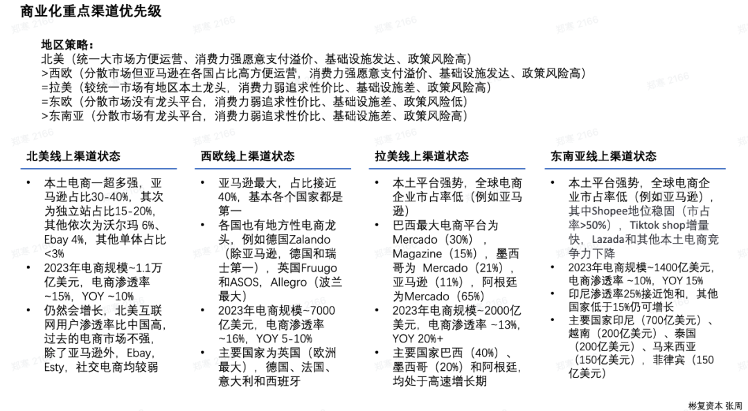 - 北美:优势在于是一个统一的大市场,拥有几亿消费者,且 Amazon 的市场占比最高,大部分电商规模都相对较小。