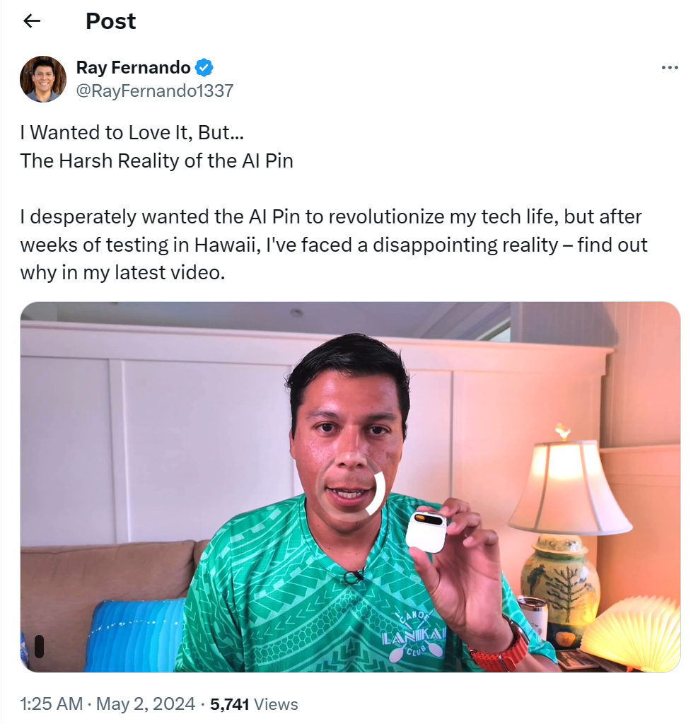 AI Pin是一款便携式 AI 设备,可以轻松别在衣物上。它通过激光投影技术在手掌上显示信息,内置 AI 助手能够通过语音命令进行网络搜索和通讯操作。AI Pin 还具备实时翻译功能,支持 50 种语言。《时代》杂志将其评选为 2023 年最佳发明之一,不到一个月预定量就超过了 450 万台。但随着第一批媒体评测解禁,大家的体验出奇的统一:美丽的废物,别买。华尔街日报记者吐槽了产品发热严重,以及激光交互在户外不能用。科技博主MKBHD 更加直接,视频标题写道:AI Pin 是他评测过的最糟糕的产品。据MKBHD 测试,AI Pin 续航时间仅为 2-4 小时;而且 AI Pin 小巧的体积带来了散热问题,不少媒体评测的时候都提到过,使用没多久 AI Pin 就提示“过热关机”;有媒体猜测,这是因为 AI Pin 要反复搜索信号所以发热。并且 AI Pin 的交互方式,繁琐且低效。在 AI Pin 在实际使用中,手势识别的准确率并不高。