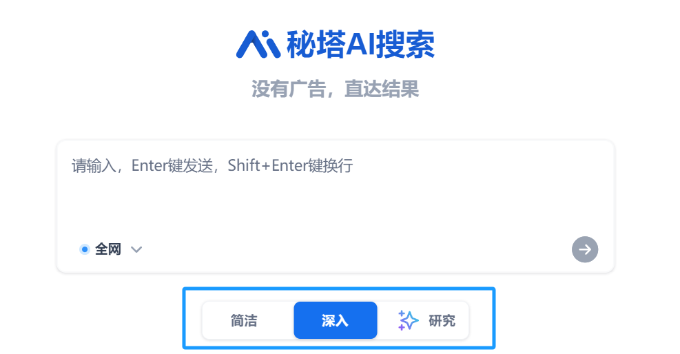 秘塔AI搜索以其无广告的界面和高效的搜索结果,为用户带来了一种清新的搜索体验。它的主页设计简洁,仅包含一个搜索框,却能根据用户需求提供多种搜索模式,如简洁、深入和研究,以满足不同场景下的搜索需求。