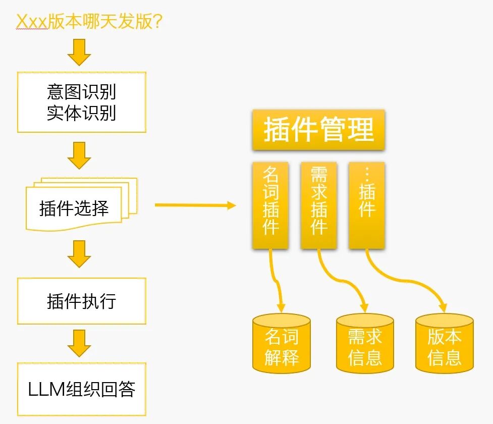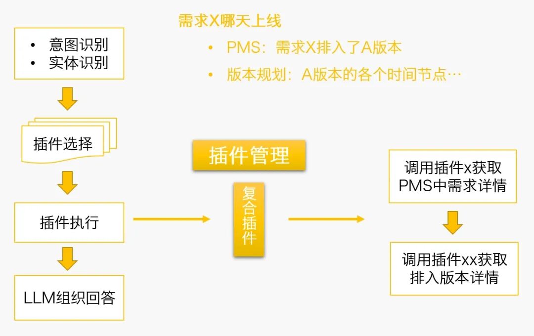 对于部分问题,无法通过一次插件交互,获取回答所需要的全部问题。比如对于特定项目,pms中对应的需求保存了需求排入的版本号,但没有上线和发版日期。在版本日历中,保存了特定版本号对应的各个时间节点。为了支持此类问题,可通过新增一个复合插件,对问题所需要的上下文分步骤完善: