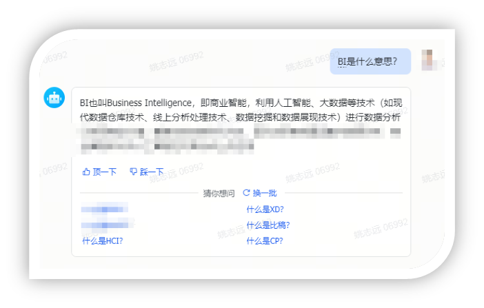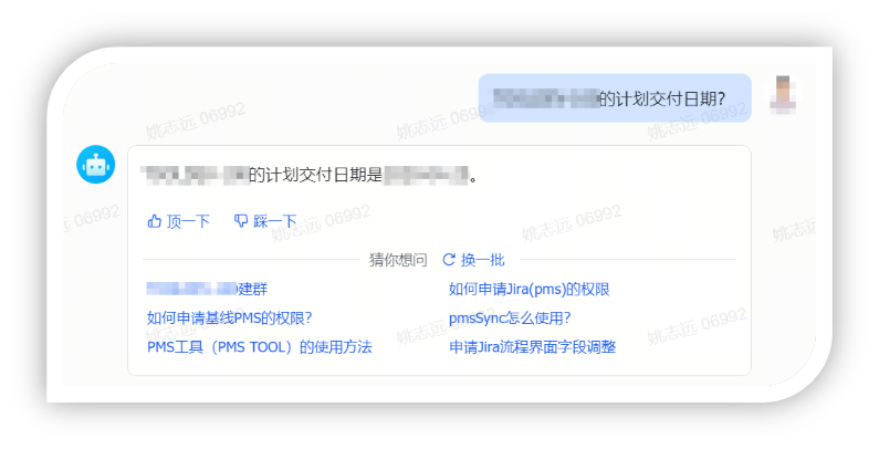项目百晓生上线静态知识问答,支持7*24小时实时响应,方便用户自主获取项目信息,提升项目透明度。同时提高信息获取效率,避免因被咨询人未及时看到消息造成的沟通阻塞。动态数据咨询帮助用户不离开及时聊天工具,无需打开&登录其他系统,快速获取所需信息。场景助手帮助业务用户在常见场景整合数据,支持部分场景跨系统数据处理,将大量手工操作自动化或半自动化,提升工作效率。