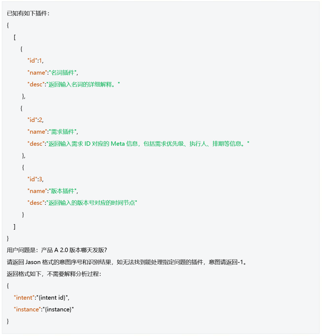 此处复合插件对于插件框架来说,与普通的插件无异,同样具有id、名称、功能描述等信息,只是复合插件的内部逻辑实现了分步骤调用其他插件,获取上下文所需信息的逻辑。获取后,将两个步骤获取的事实组合起来,提交给大语言模型:
